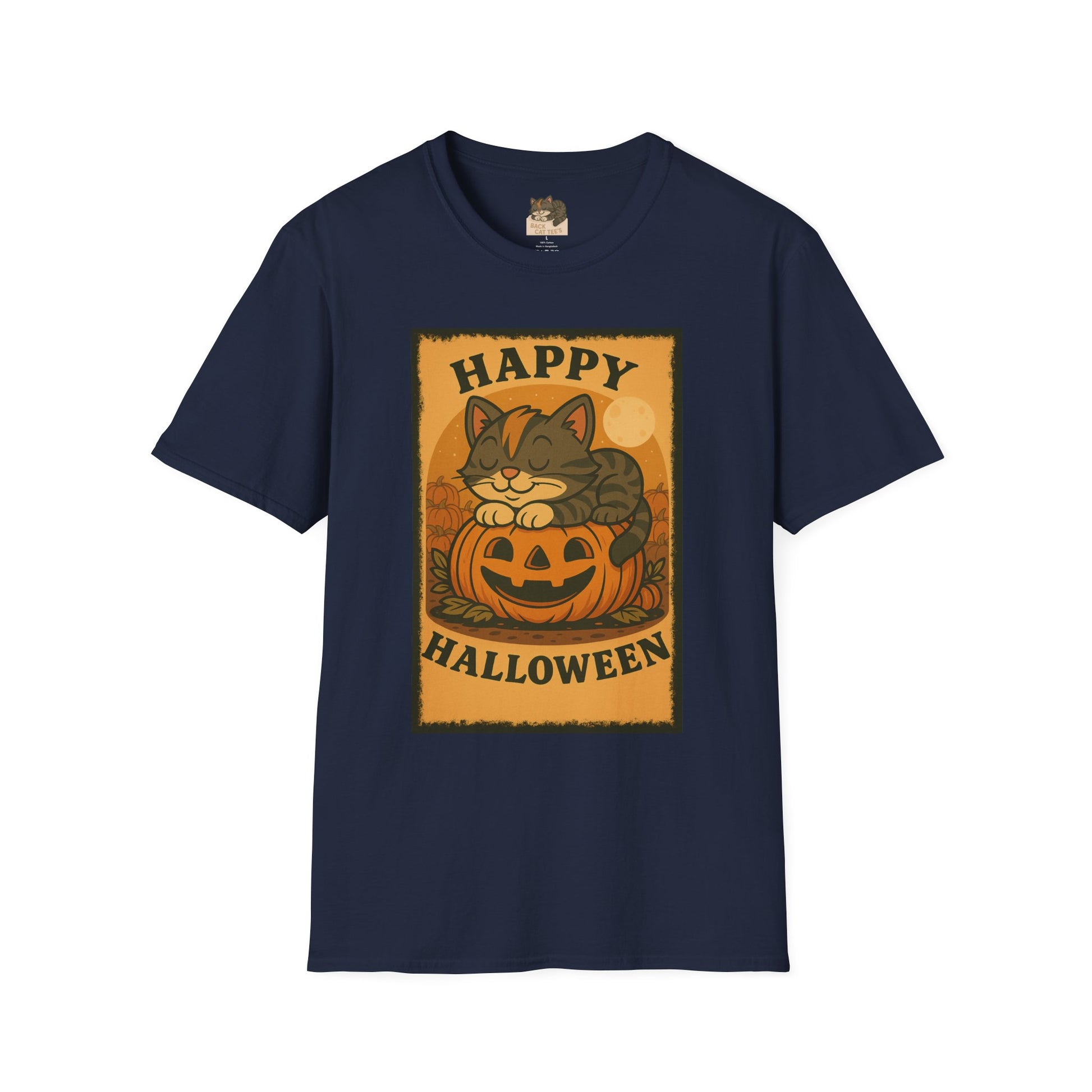 Celebrate the season in style with our “Happy Halloween Cat” Graphic Tee! This festive shirt showcases an adorable gray tabby cat peacefully napping on top of a cheerful jack-o’-lantern, set against a glowing harvest moon and pumpkin patch backdrop. The playful design perfectly captures the charm and coziness of Halloween night, blending cuteness with spooky-season fun.