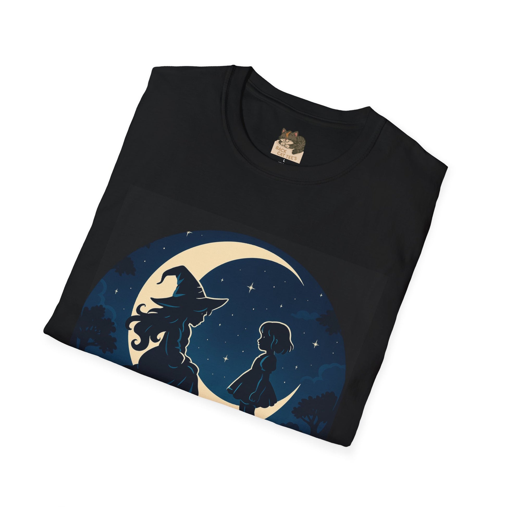 Introducing a delightful Unisex Softstyle T-Shirt that blends comfort with a touch of magic. Featuring a mystical Halloween-inspired design, this shirt showcases the silhouette of a young witch with a pointed hat and flowing hair facing a little girl, both standing on a branch beneath a glowing crescent moon. Set against a starry night sky framed by clouds and trees, the bold, storybook-style artwork pops beautifully on a dark tee.